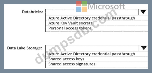 You need to recommend which authentication methods to use for Databricks and Data Lake Storage to provide the users with the appropriate access. The solution must minimize administrative effort and development effort.