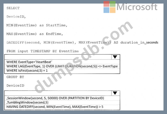 How should you complete the Stream Analytics SQL query? To answer, select the appropriate options in the answer area.