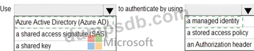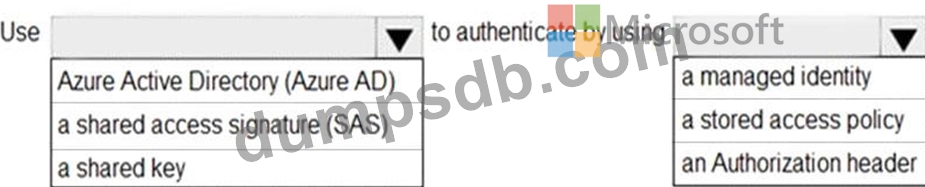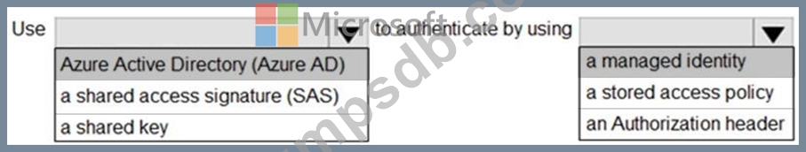 How should you configure access to the storage account for the data factory? To answer, select the appropriate options in the answer area.