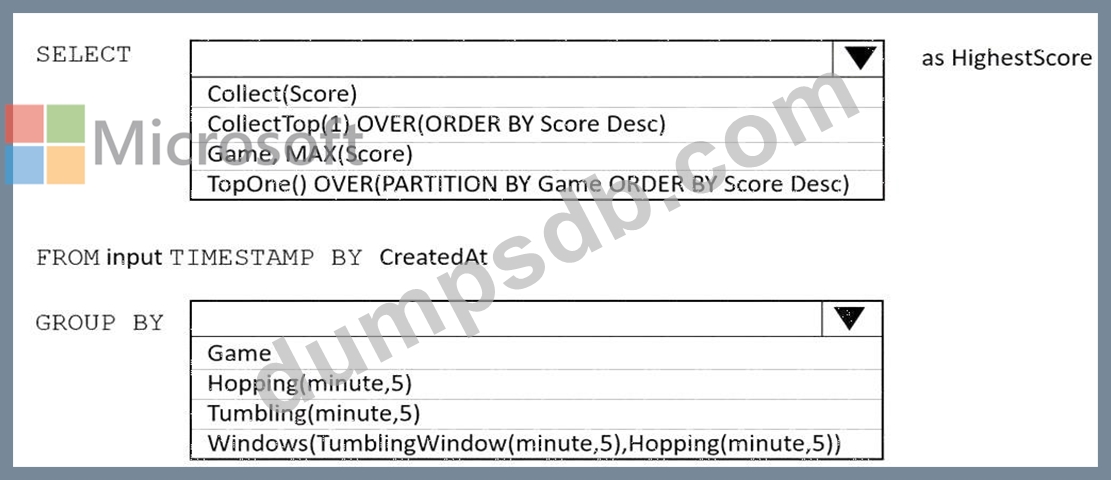 How should you complete the Stream Analytics query? To answer, select the appropriate options in the answer area.