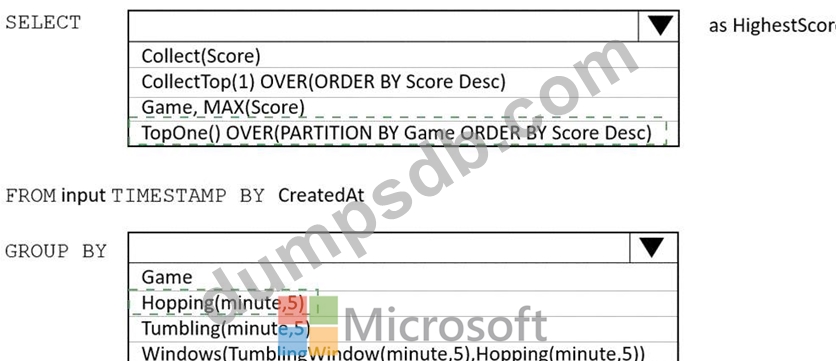You need to ensure that the job returns the highest scoring record for each five-minute time interval of each game.