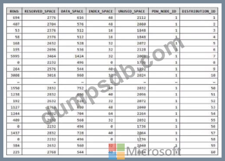 You run PDW_SHOWSPACEUSED(dbo,FactInternetSales'); and get the results shown in the following table.