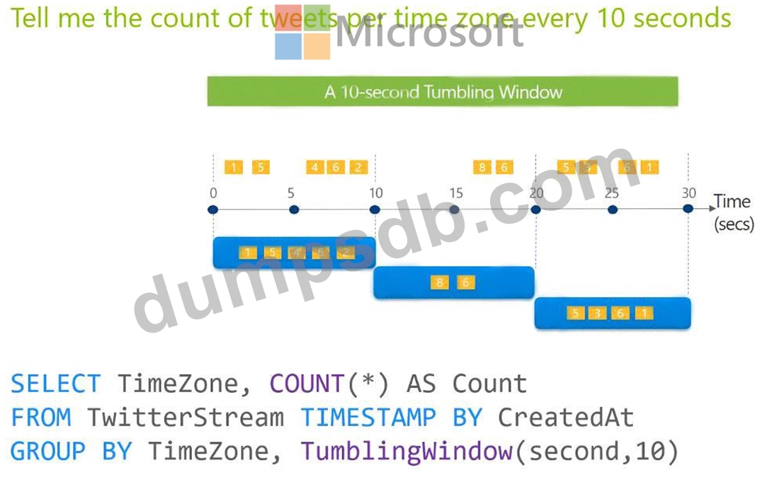 Solution: You use a tumbling window, and you set the window size to 10 seconds.