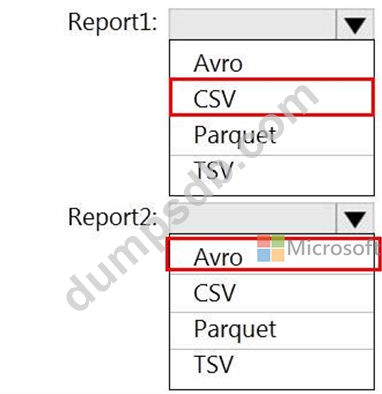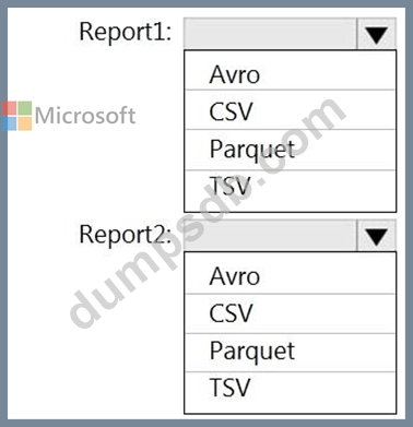 You need to recommend in which format to store the data in the data lake to support the reports. The solution must minimize read times.