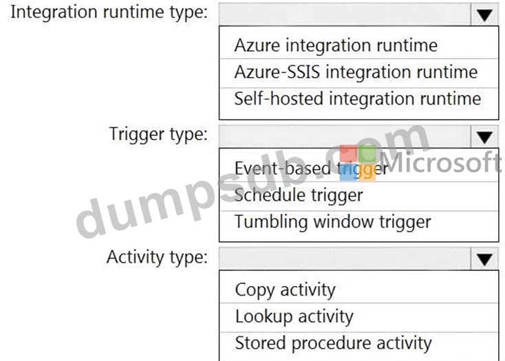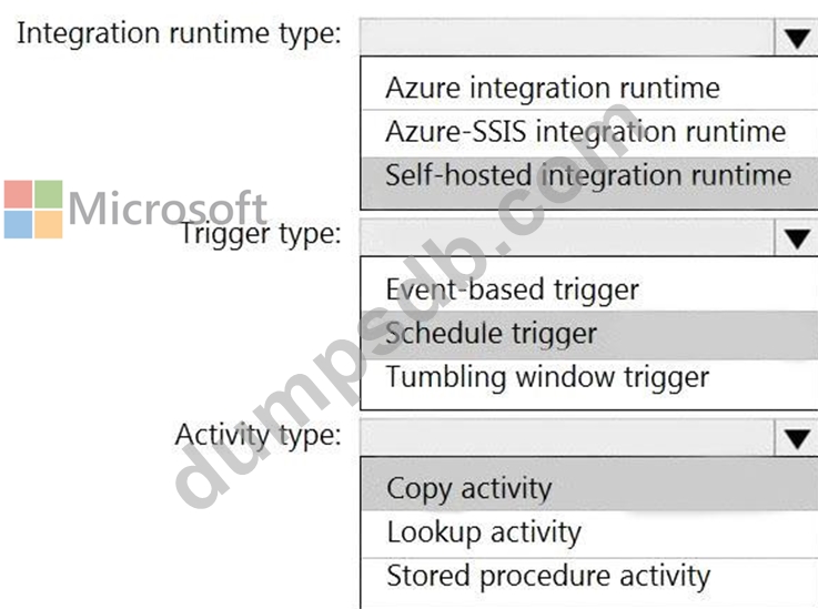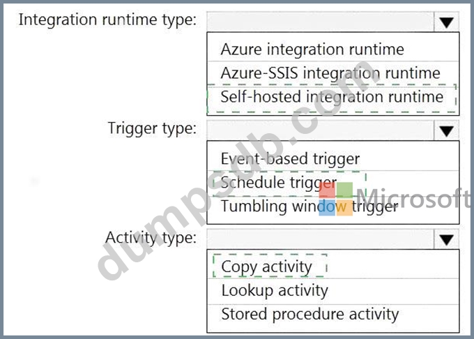 Which Azure Data Factory components should you recommend using together to import the daily inventory data from the SQL server to Azure Data Lake Storage? To answer, select the appropriate options in the answer area.