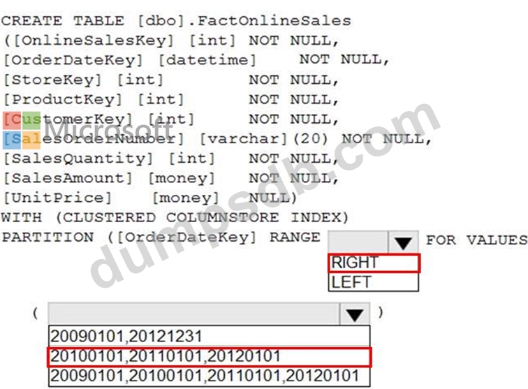 You have an enterprise data warehouse in Azure Synapse Analytics that contains a table named FactOnlineSales. The table contains data from the start of 2009 to the end of 2012.