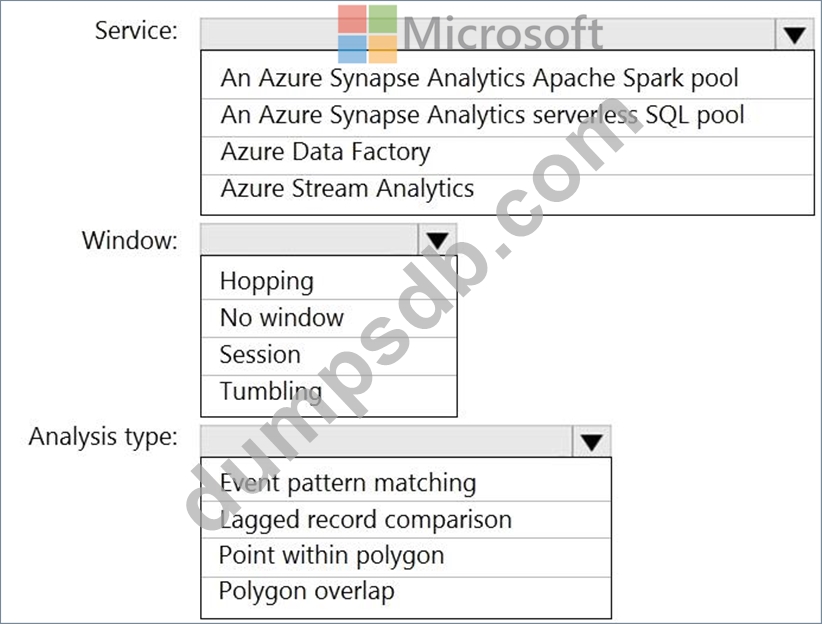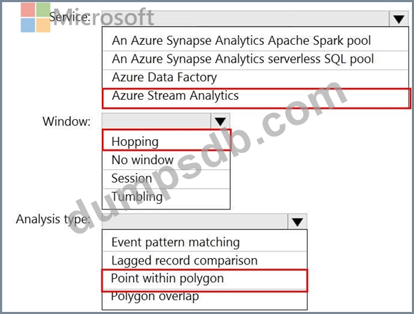 You are designing a monitoring solution for a fleet of 500 vehicles. Each vehicle has a GPS tracking device that sends data to an Azure event hub once per minute.