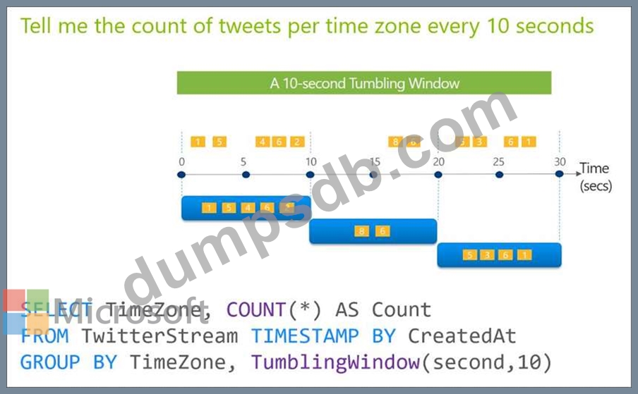 Solution: You use a tumbling window, and you set the window size to 10 seconds.