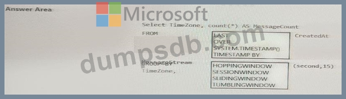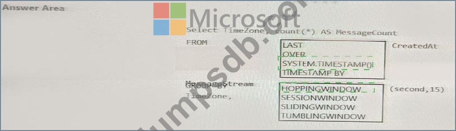 You need to ensure that the output from the Stream Analytics job counts the number of messages per time zone every 15 seconds.