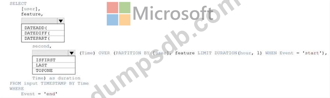 How should you complete the Stream Analytics query? To answer, select the appropriate options in the answer area.