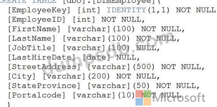 You have a table in an Azure Synapse Analytics dedicated SQL pool. The table was created by using the following Transact-SQL statement.