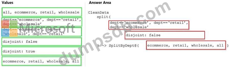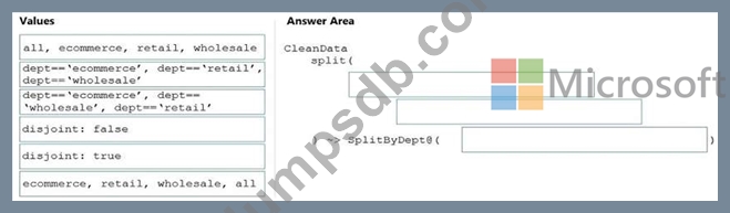 How should you complete the Data Factory data flow script? To answer, drag the appropriate values to the correct targets. Each value may be used once, more than once, or not at all. You may need to drag the split bar between panes or scroll to view content.