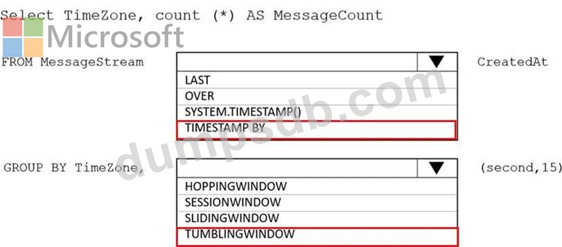 You need to ensure that the output from the Stream Analytics job counts the number of messages per time zone every 15 seconds.