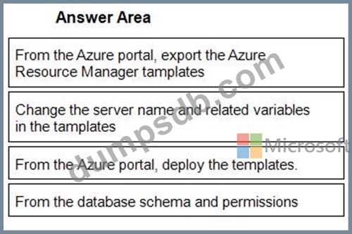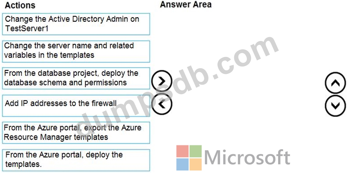 You have a resource group named App1Dev that contains an Azure SQL Database server named DevServer1. DevServer1 contains an Azure SQL database named DB1. The schema and permissions for DB1 are saved in a Microsoft SQL Server Data Tools (SSDT) database project. You need to populate a new resource group named App1Test with the DB1 database and an Azure SQL Server named TestServer1. The resources in App1Test must have the same configurations as the resources in App1Dev. Which four actions should you perform in sequence? To answer, move the appropriate actions from the list of actions to the answer area and arrange them in the correct order.