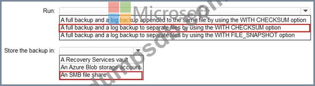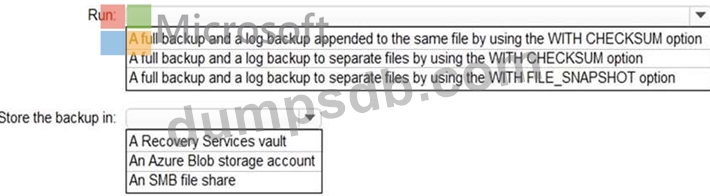 You have an on-premises Microsoft SQL Server 2019 instance that hosts a database named DB1. You plan to perform an online migration of DB1 to an Azure SQL managed instance by using the Azure Database Migration Service. You need to create a backup of DB1 that is accessible to the Azure Database Migration Service. What should you run for the backup and where should you store the backup? To answer, select the appropriate options in the answer area. NOTE: Each correct selection is worth one point.
