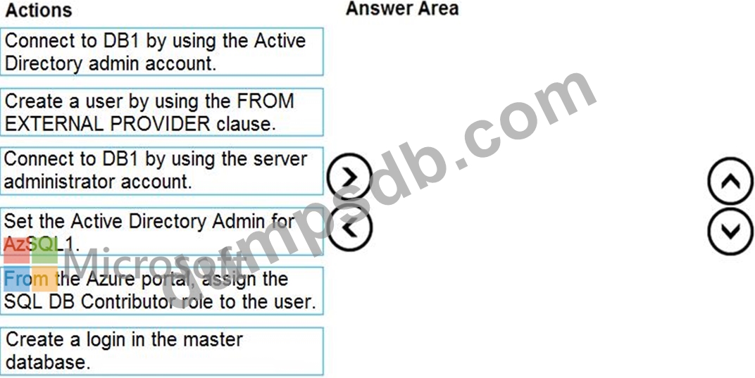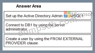 You need to create a contained database user in DB1 who will use Azure Active Directory (Azure AD) for authentication.