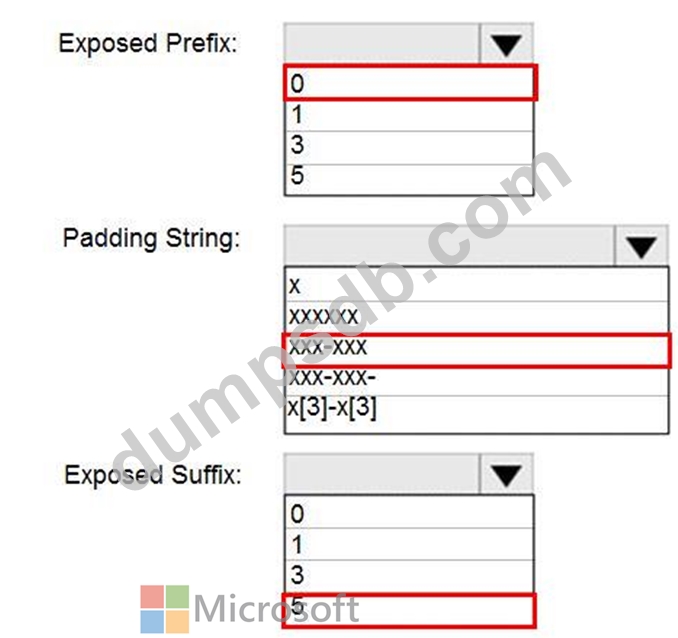 How should you configure the dynamic data mask? To answer, select the appropriate options in the answer area.