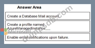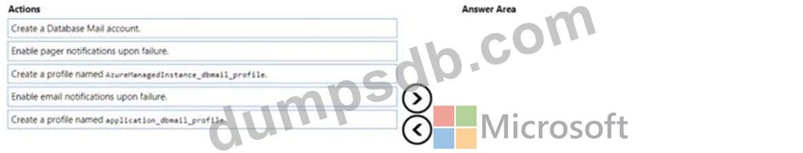You create a new Azure SQL managed instance named SQL1 and enable Database Mail extended stored You need to ensure that SQ Server Agent jobs running on SQL 1 can notify when a failure Occurs Which three actions should you perform in sequence 7 TO answer. move the appropriate actions from the list Of actions to answer area and arrange them in correct order.