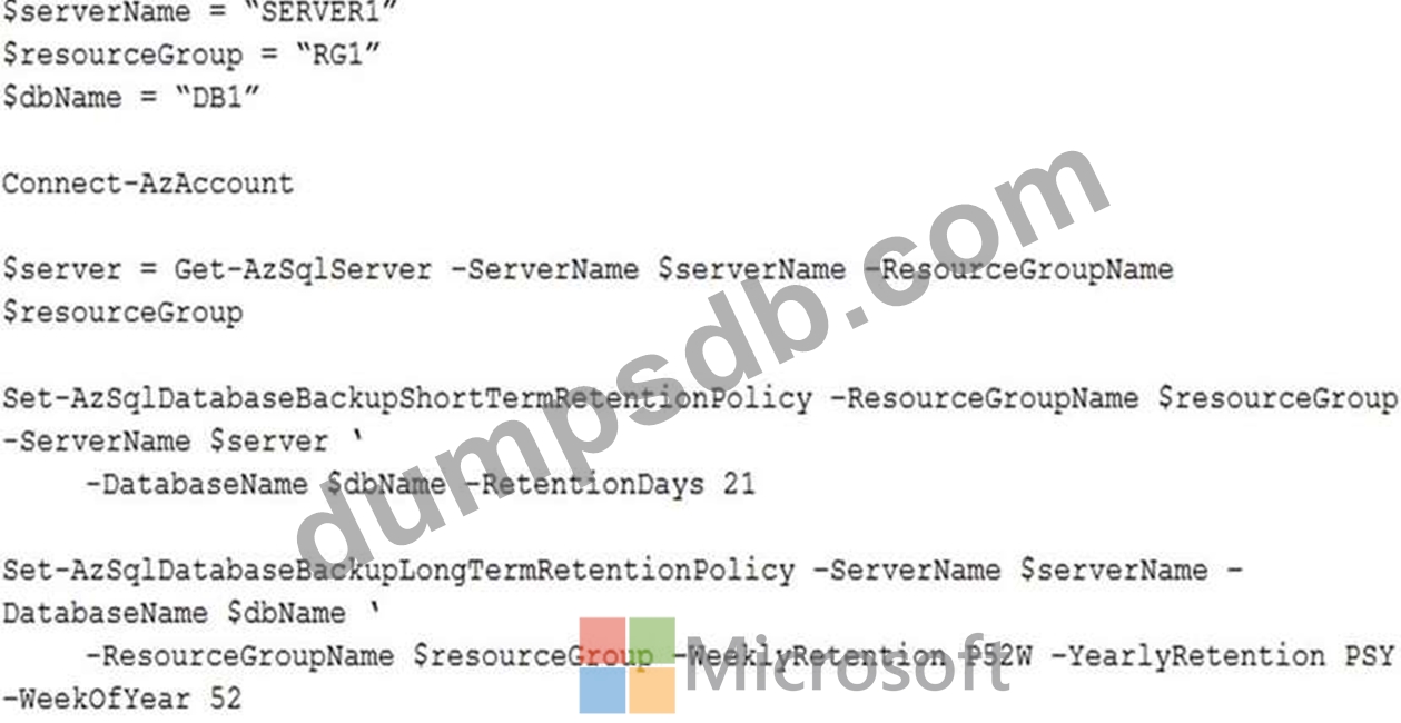 Solution: From the Azure portal, you delete Database1 from Server2, and then you create a new database on Server2 by using the backup of Database1 from Server1.