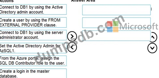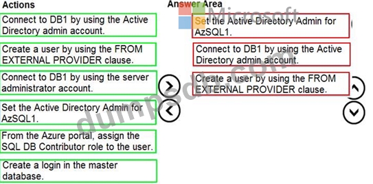 You need to create a contained database user in DB1 who will use Azure Active Directory (Azure AD) for authentication.