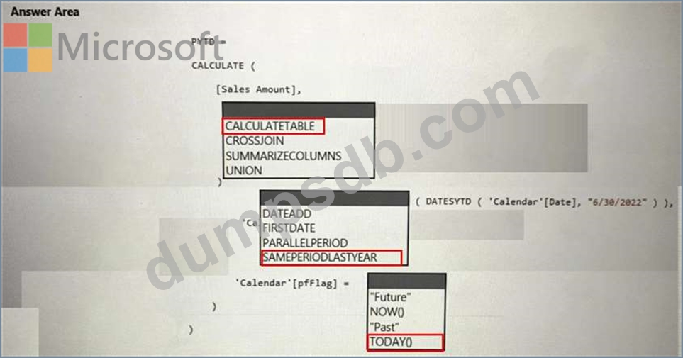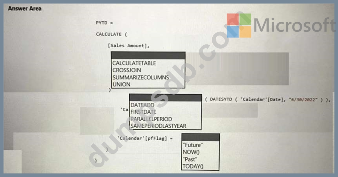 How should you complete the DAX expression? To answer, select the appropriate options in the answer area.