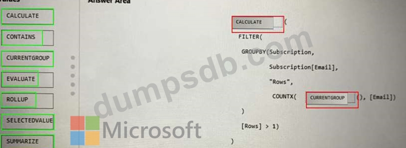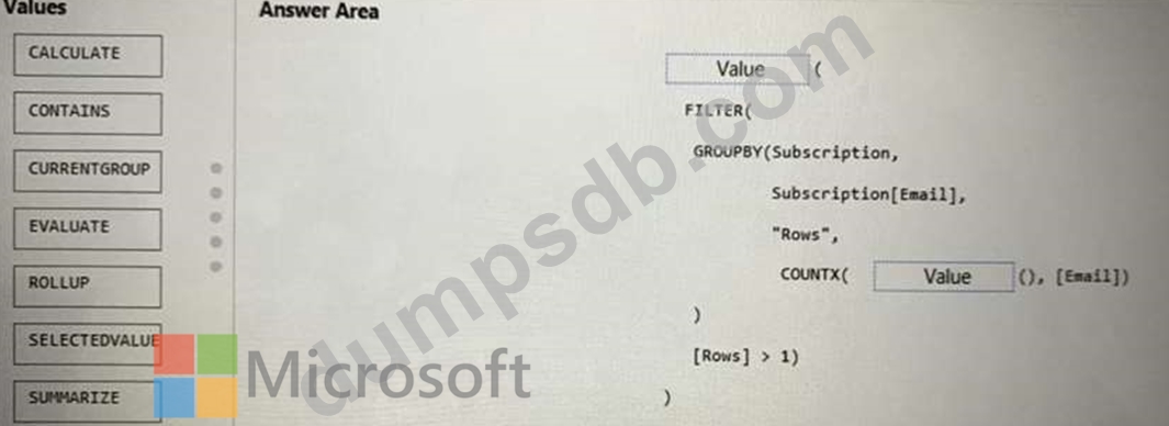 How should you complete the DAX expression? To answer, drag the appropriate values to the targets. Each value may be used once, more than once. may need to drag the split bar between panes or scroll to view content.