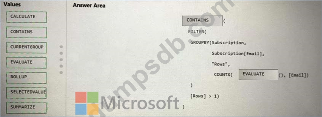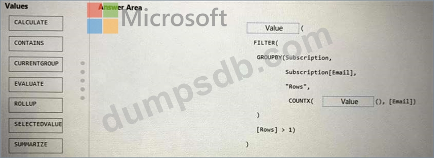 How should you complete the DAX expression? To answer, drag the appropriate values to the targets. Each