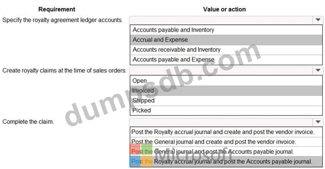 How should you set up the royalty agreement? To answer, select the appropriate options in the answer area.