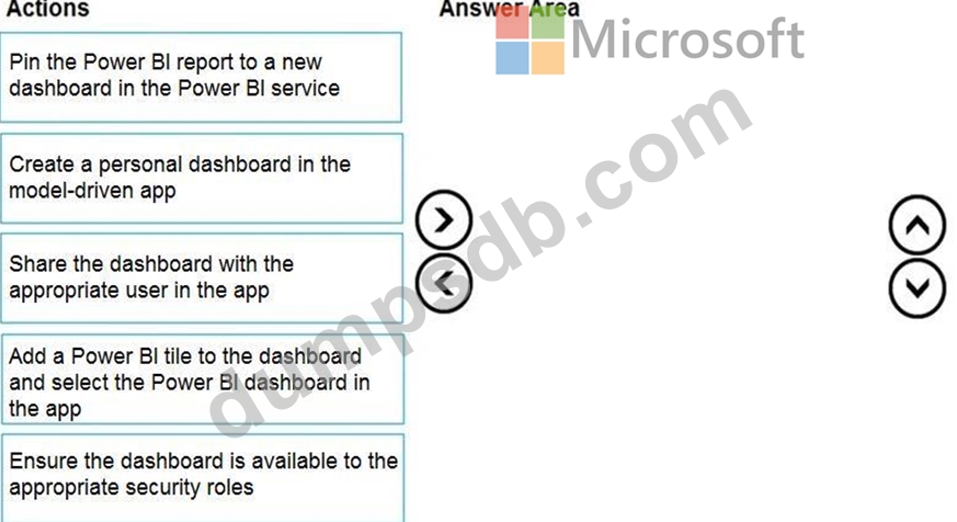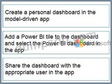 You create a report by using Power Bl Desktop and publish the report to the Power Bl service. You enable Power Bl visualization embedding in a model-driven app.