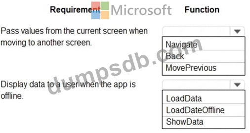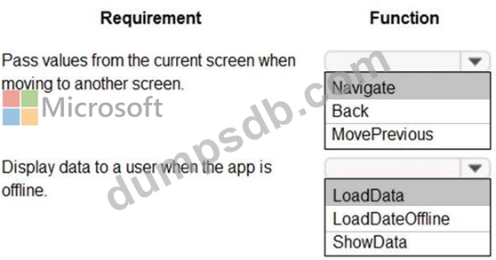You are designing a canvas app that connects to Common Data Service. You need to configure the app to meet the requirements and ensure that the canvas app is available offline. What should you implement? To answer, select the appropriate options in the answer area. NOTE: Each correct selection is worth one point.