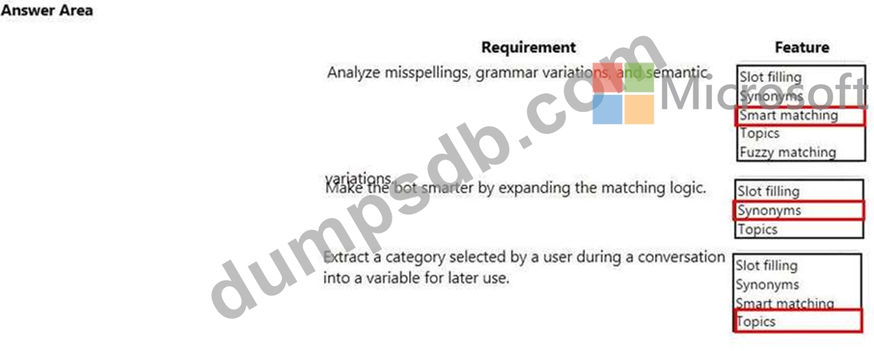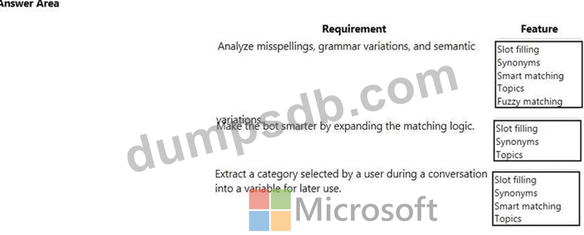 You are designing a Power Virtual Agents chatbot for a store. You need to teach the chatbot to acknowledge the store's product categories and the variations within specific categories. You need to create custom entities to provide the chatbot with the knowledge of the product categories. Which features should you use? To answer, select the appropriate options in the answer area. NOTE: Each correct selection is worth one point.