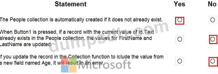 You have a canvas app that contains the following text input fields: Id, FirstName, LastName. The app also has a button named Button1. The OnSelect property for Button1 contains the following expression: Collect(People, {Id:Id.Text, FirstName:FirstName.Text, LastName:LastName.Text}) For each of the following statements, select Yes if the statement is true. Otherwise, select No. NOTE: Each correct selection is worth one point.