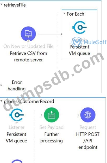 This Mule application is deployed to multiple Cloudhub workers with persistent queue enabled. The retrievefile flow event source reads a CSV file from a remote SFTP server and then publishes each record in the CSV file to a VM queue. The processCustomerRecords flow's VM Listner receives messages from the same VM queue and then processes each message separately.