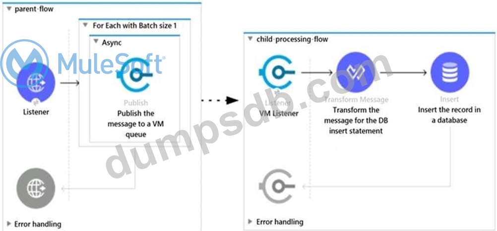 Refer to the exhibit. A Mule 4 application has a parent flow that breaks up a JSON array payload into 200 separate items, then sends each item one at a time inside an Async scope to a VM queue.