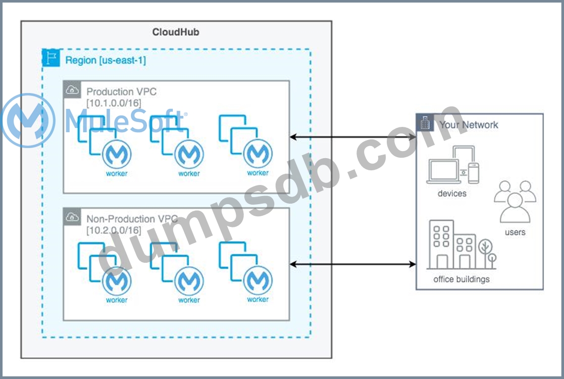 A company requires Mule applications deployed to CloudHub to be isolated between non-production and production environments. This is so Mule applications deployed to non-production environments can only access backend systems running in their customer-hosted non-production environment, and so Mule applications deployed to production environments can only access backend systems running in their customer-hosted production environment. How does MuleSoft recommend modifying Mule applications, configuring environments, or changing infrastructure to support this type of per-environment isolation between Mule applications and backend systems?