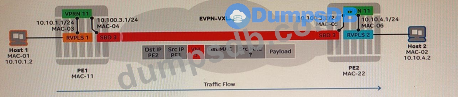 In the exhibit, the interface-ful numbered model is used for the Layer-3 EVPN service. Which of the following is used as the source MAC address in the packets sent from PEI when forwarding customer traffic to Host 2?