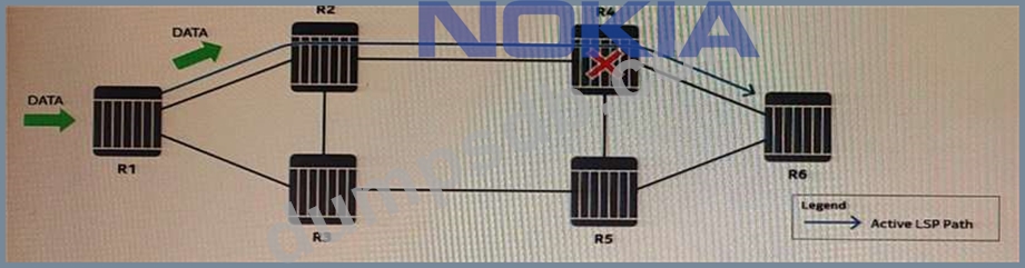 An SR-TE LSP with a path definition that includes router R4 as a loose hop and for which Seamless-BFD has been enabled is following the path shown in the exhibit. What happens after router R4 fails if the routers along the path follow the default behavior?