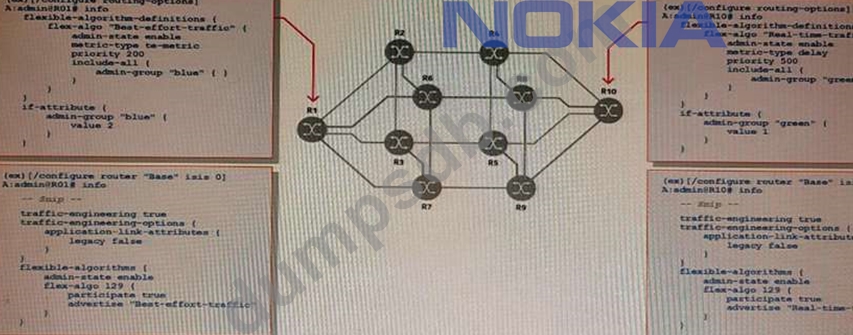 Based on the configuration shown for routers R1 and R10, what valid flex-algo definitions exist in the network?