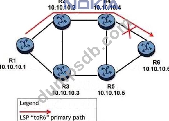An LSP traverses R1-R2-R4-R6 and facility fast reroute with link protection is enabled. All links have the same cost.
