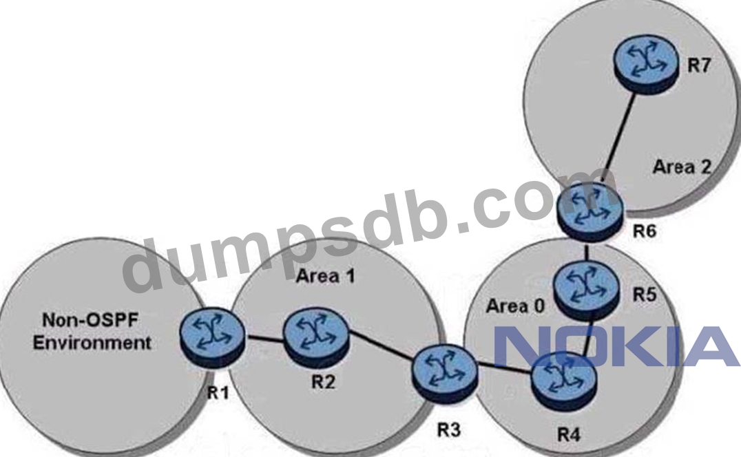 In the topology shown, router R1 is an ASBR configured to export external routes to OSPF.