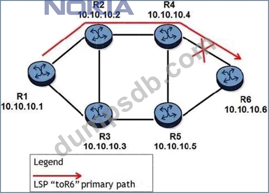 An LSP path is established on router R1 toward router R6. After router R4 detects that the link between routers R4 and