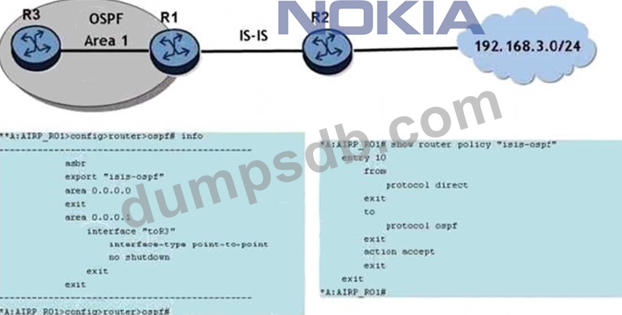 Router R1 learns the network 192.168.3.0/24 from IS-IS.