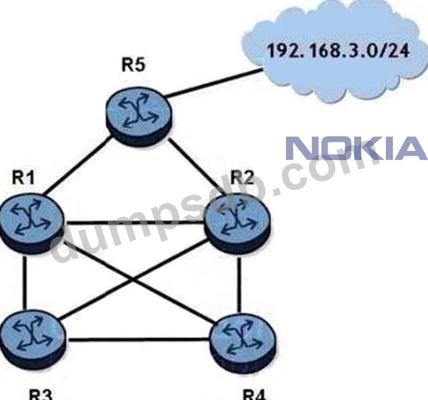 OSPF is operational on all links in the network diagram, all routers are the same cost, and all routers are configured with an ECMP value. Router R5 advertises the prefix 192.168.3.0/24 into OSPF.