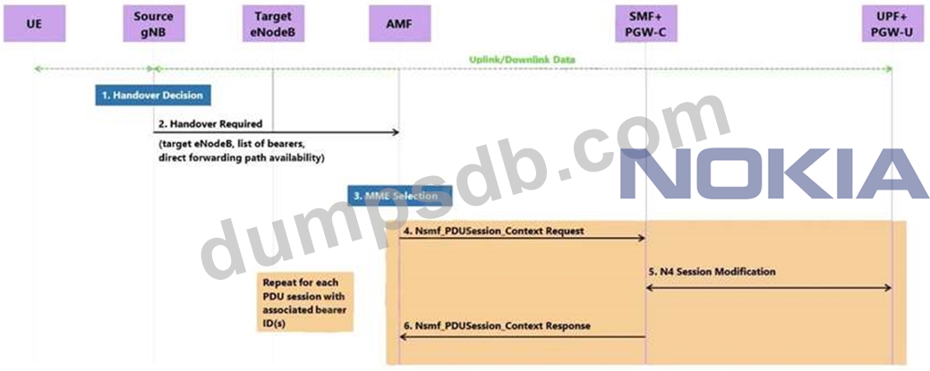 The exhibit below illustrates signaling messages exchanged during a 5GS to EPS Handover procedure using N26. Which information is NOT provided to AMF in step 6 for a PDU session that supports interworking?