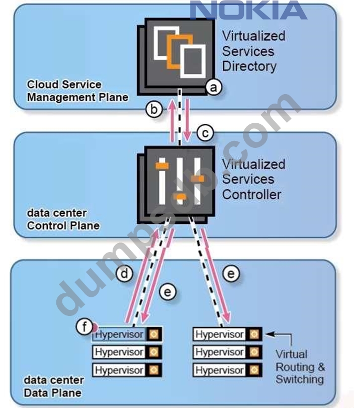 b. VSC queries VSD on network service and policies. c. VSD provides VSC with network service and policies. d. VRS agent informs VSC of the new VM placement. e. VSC deploys policy to applicable VRS agents. f. VM instantiated on the hypervisor.