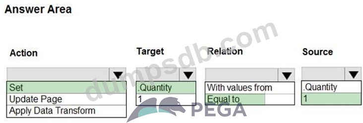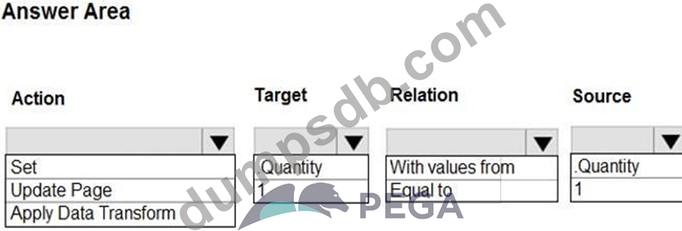 In the Answer Area, select the Data Transform configuration that defaults the Quantity property value on a Purchase Request case to 1.