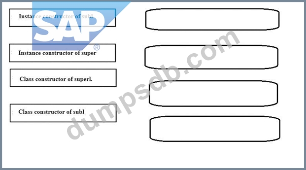 Explanation The sequence in which the constructors will be executed is as follows: Class constructor of superl. This is because the class constructor is a static method that is executed automatically before the class is accessed for the first time. The class constructor is used to initialize the static attributes and components of the class. The class constructor of the superclass is executed before the class constructor of the subclass, as the subclass inherits the static components of the superclass12 Class constructor of subl. This is because the class constructor is a static method that is executed automatically before the class is accessed for the first time. The class constructor is used to initialize the static attributes and components of the class. The class constructor of the subclass is executed after the class constructor of the superclass, as the subclass inherits the static components of the superclass12 Instance constructor of superl. This is because the instance constructor is an instance method that is executed automatically when an instance of the class is created using the statement CREATE OBJECT. The instance constructor is used to initialize the instance attributes and components of the class. The instance constructor of the superclass is executed before the instance constructor of the subclass, as the subclass inherits the instance components of the superclass. The instance constructor of the subclass must call the instance constructor of the superclass explicitly using super->constructor, unless the superclass is the root node object12 Instance constructor of subl. This is because the instance constructor is an instance method that is executed automatically when an instance of the class is created using the statement CREATE OBJECT. The instance constructor is used to initialize the instance attributes and components of the class. The instance constructor of the subclass is executed after the instance constructor of the superclass, as the subclass inherits the instance components of the superclass. The instance constructor of the subclass must call the instance constructor of the superclass explicitly using super->constructor, unless the superclass is the root node object12 References: Constructors of Classes - ABAP Keyword Documentation, METHODS - constructor - ABAP Keyword Documentation