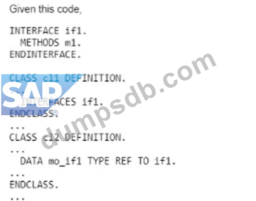 The following are the explanations for each statement: C: This statement is valid. Class CL1 uses the interface. This is because class CL1 implements the interface ifl using the INTERFACES statement in the public section of the class definition. The INTERFACES statement makes the class compatible with the interface and inherits all the components of the interface. The class can then use the interface components, such as the method ml, by using the interface component selector ~, such as ifl~ml12 E: This statement is valid. Class CL1 implements the interface. This is because class CL1 implements the interface ifl using the INTERFACES statement in the public section of the class definition. The INTERFACES statement makes the class compatible with the interface and inherits all the components of the interface. The class must then provide an implementation for the interface method ml in the implementation part of the class, unless the method is declared as optional or abstract12 D: This statement is valid. In class CL2, the interface method is named ifl~ml. This is because class CL2 has a data member named m0_ifl of type REF TO ifl, which is a reference to the interface ifl. The interface ifl defines a method ml, which can be called using the reference variable m0_ifl. The interface method ml has the name ifl~ml in the class, where ifl is the name of the interface and the character ~ is the interface component selector12 The other statements are not valid, as they have syntax errors or logical errors. These statements are: A: This statement is not valid. In class CL1, the interface method is named ifl~ml, not if-ml. This is because class CL1 implements the interface ifl using the INTERFACES statement in the public section of the class definition. The interface ifl defines a method ml, which can be called using the class name or a reference to the class. The interface method ml has the name ifl~ml in the class, where ifl is the name of the interface and the character ~ is the interface component selector. Using the character - instead of the character ~ will cause a syntax error12 B: This statement is not valid. Class CL2 does not use the interface, but only has a reference to the interface. This is because class CL2 has a data member named m0_ifl of type REF TO ifl, which is a reference to the interface ifl. The interface ifl defines a method ml, which can be called using the reference variable m0_ifl. However, class CL2 does not implement the interface ifl, nor does it inherit the interface components. Therefore, class CL2 does not use the interface, but only references the interface12