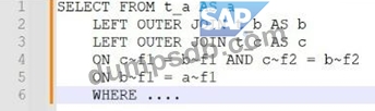 Explanation The nested join is evaluated from the top to the bottom in the order of the ON conditions. This means that the join expression is formed by assigning each ON condition to the directly preceding JOIN from left to right. The join expression can be parenthesized implicitly or explicitly to show the order of evaluation. In this case, the implicit parentheses are as follows: SELECT * FROM (a INNER JOIN (b INNER JOIN c ON b~c = c~c) ON a~b = b~b) This means that the first join expression is b INNER JOIN c ON b~c = c~c, which joins the columns of tables b and c based on the condition that b~c equals c~c. The second join expression is a INNER JOIN (b INNER JOIN c ON b~c = c~c) ON a~b = b~b, which joins the columns of table a and the result of the first join expression based on the condition that a~b equals b~b. The final result set contains all combinations of rows from tables a, b, and c that satisfy both join conditions. References: 1: SELECT, FROM JOIN - ABAP Keyword Documentation - SAP Online Help
