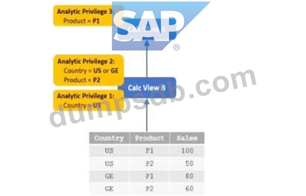 Two calculation views, A and B, are defined as shown in the diagram. Three analytic privileges have been granted to you.